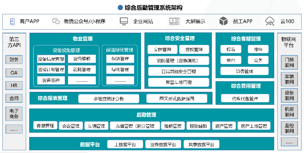 将食堂管理、物业管理、房产管理、安防管理、车辆管理,设备管理等模块融合到统一平台上,实现省、地市公司的信息共享与传递,实现精准化管理、降本增效的管理理念。